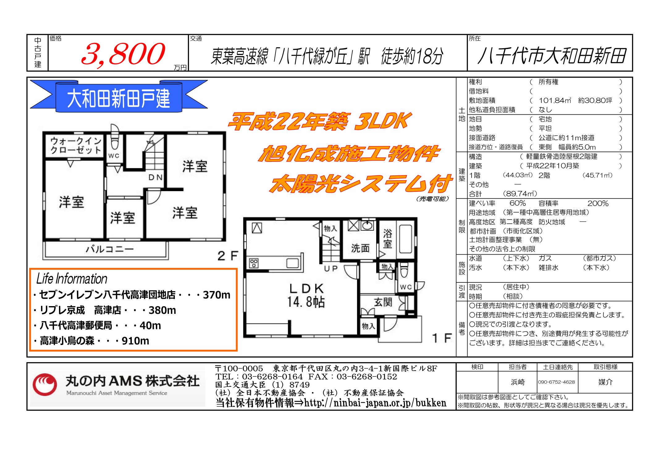 | 戸建 | 八千代市大和田新田 | 3,800万円 | 有 | 居住中 | OK | 浜崎 | ○ |