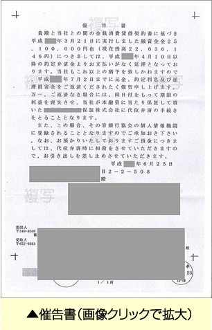 債権者からの催告書には、「○月○日に支払いがありませんでした。よって、期限の利益を喪失しましたので、一括で支払うように催告します」と書かれたものが届きます。